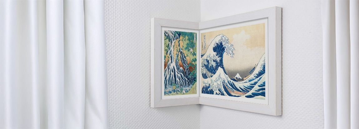 Es gibt prinzipiell zwei verschiedene Arten von Bilderrahmen, die an einer Ecke verwendet werden können. Zunächst gibt es die In-die-Ecke Rahmen. Diese können zum Beispiel in einem herkömmlichen Zimmer verwendet werden. Der „Knick“ des Rahmens geht also in die Ecke hinein. Wenn man sich einen Pfeil vorstellt, hat der Rahmen die Form der Spitze des Pfeiles, wenn dieser von Ihnen weg zeigt. Der Um-die-Ecke-Rahmen ist in der Pfeilanalogie die Variante, wenn der Pfeil auf Sie zeigt, das bedeutet, die Ecke des „Knicks“ geht in den Raum hinein. Diese Art von Eckrahmen kann wunderbar an Säulen verwendet werden oder auch in Räumen, die ungewöhnliche Winkel haben.
