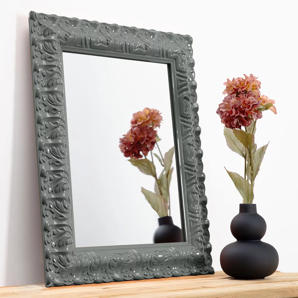 Barock trifft auf Pop! Dieser außergewöhnliche Spiegelrahmen kombiniert klassisches Design mit modernen Farben. Das geschwungene, breite Profil ist detailreich verziert mit floralen Ornamenten im traditionellen Barockstil – doch die Lackierung in einem von 55 satten Farbtönen verleiht ihm einen poppigen Look.