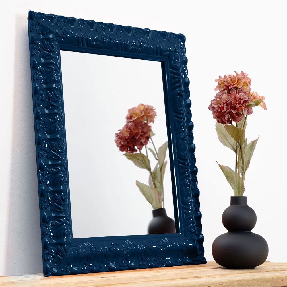 Barock trifft auf Pop! Dieser außergewöhnliche Spiegelrahmen kombiniert klassisches Design mit modernen Farben. Das geschwungene, breite Profil ist detailreich verziert mit floralen Ornamenten im traditionellen Barockstil – doch die Lackierung in einem von 55 satten Farbtönen verleiht ihm einen poppigen Look.
