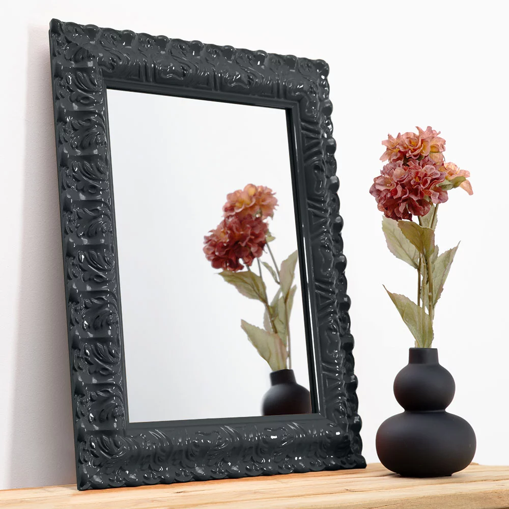 Barock trifft auf Pop! Dieser außergewöhnliche Spiegelrahmen kombiniert klassisches Design mit modernen Farben. Das geschwungene, breite Profil ist detailreich verziert mit floralen Ornamenten im traditionellen Barockstil – doch die Lackierung in einem von 55 satten Farbtönen verleiht ihm einen poppigen Look.