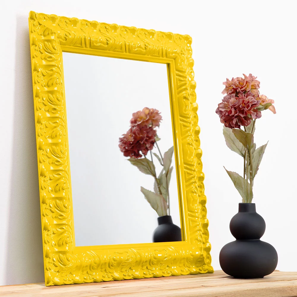 Barock trifft auf Pop! Dieser außergewöhnliche Spiegelrahmen kombiniert klassisches Design mit modernen Farben. Das geschwungene, breite Profil ist detailreich verziert mit floralen Ornamenten im traditionellen Barockstil – doch die Lackierung in einem von 55 satten Farbtönen verleiht ihm einen poppigen Look.