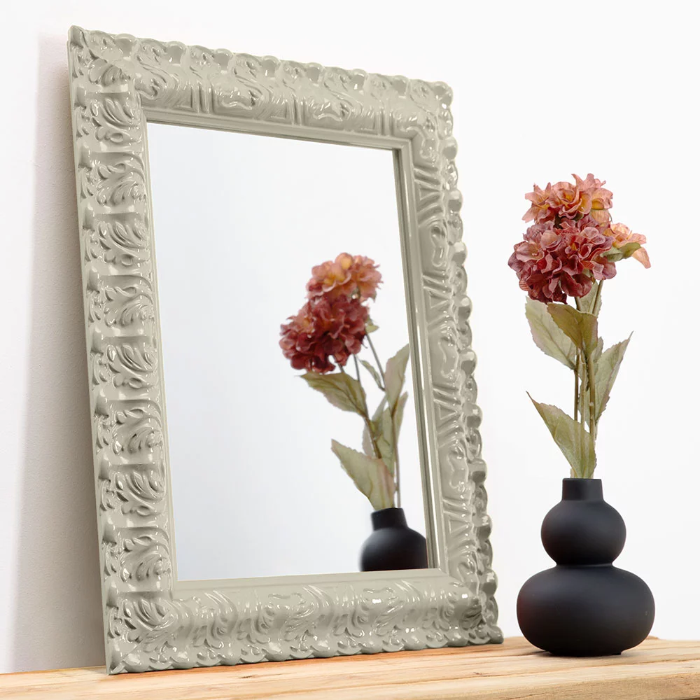 Barock trifft auf Pop! Dieser außergewöhnliche Spiegelrahmen kombiniert klassisches Design mit modernen Farben. Das geschwungene, breite Profil ist detailreich verziert mit floralen Ornamenten im traditionellen Barockstil – doch die Lackierung in einem von 55 satten Farbtönen verleiht ihm einen poppigen Look.